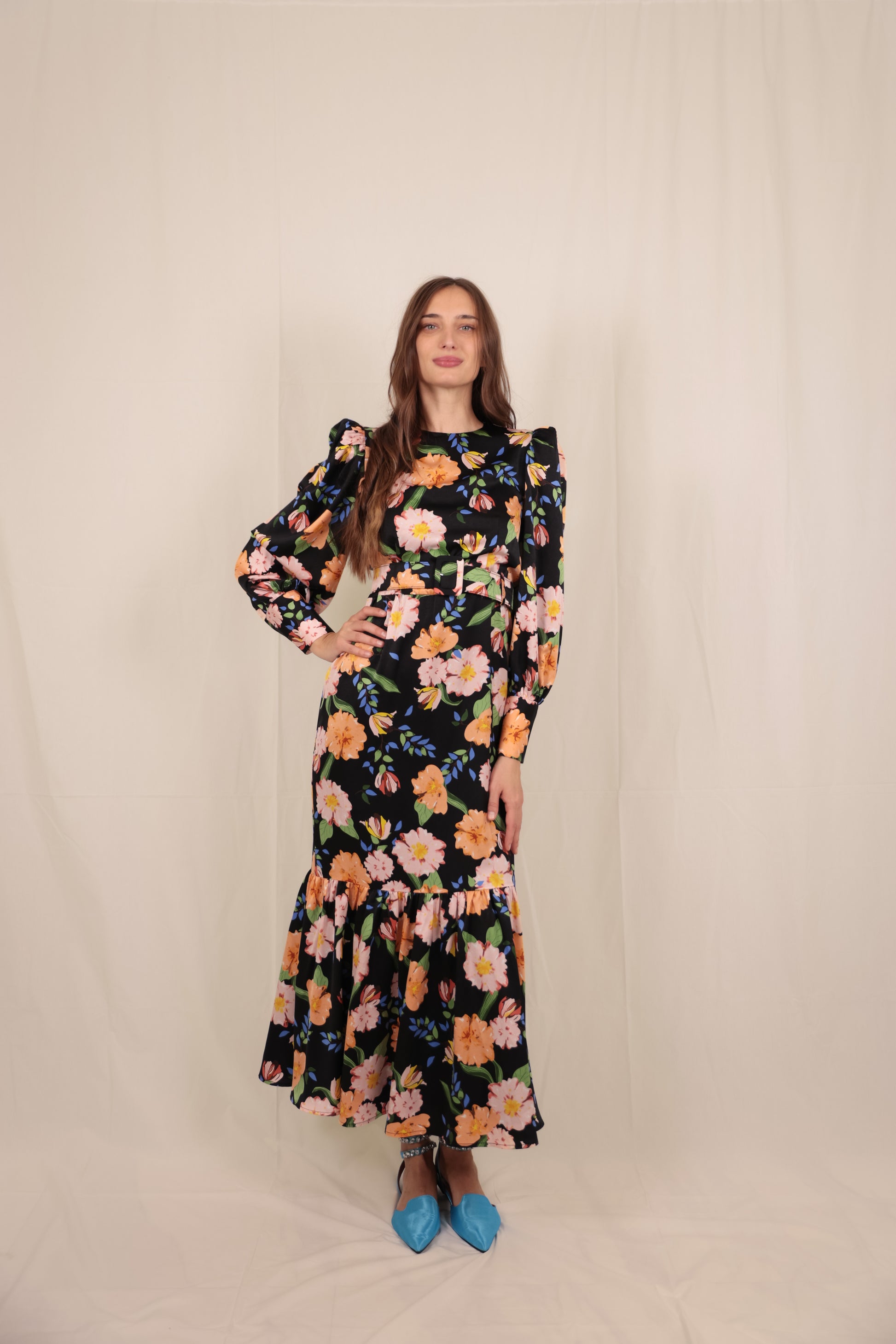 The Anastasia Maxi Dress is an elegant and beautiful piece with a soft, buttery feel. It comes with a belt and features puffed shoulders, while the bottom showcases a tiered design with a floral pattern, making it perfect for summer.