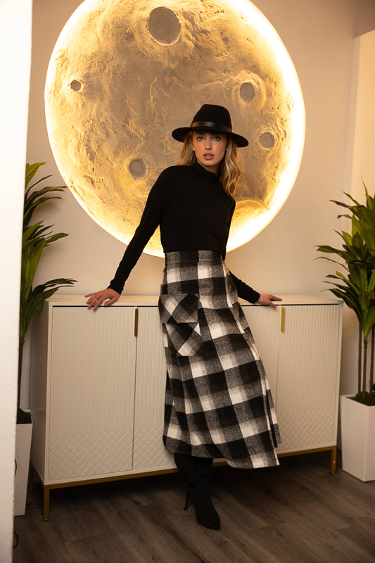 The B&W Plaid Skirt features a bold plaid design and oversized side pockets for a touch of utility and style. Made from soft wool, it's a warm and versatile piece perfect for cooler days.