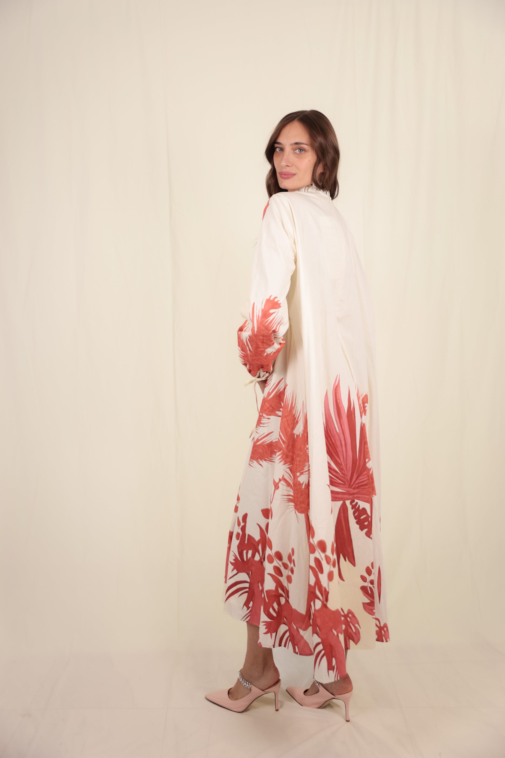 The Elione Dress is a unique cotton piece that is light and airy, perfect for summer. It features an elastic cuff at the bottom and comes in a lovely mauve color and a beautiful off-white beige. This lightweight dress is easy to wear and can be styled for more formal summer events.