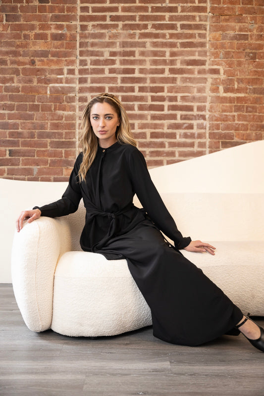 The Eloise Noir Dress is a comfortable, full-length maxi with a clean, simple silhouette. It features a front tie belt attached at the waist, offering a flattering fit with minimal effort.