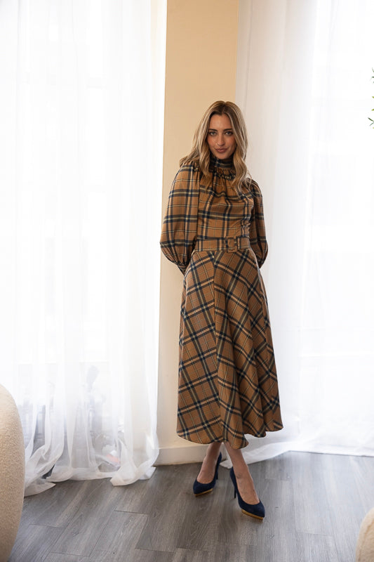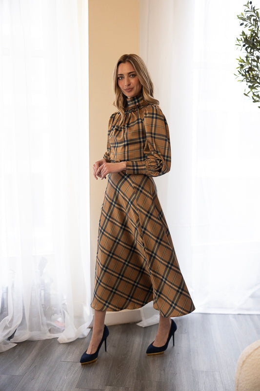 The Emmeline Plaid Set features a gathered neckline, balloon sleeves, and a classic plaid design. With its matching belt and A-line fit, it offers a flattering silhouette.