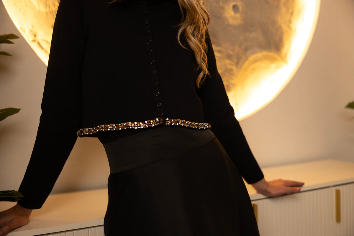 The Shay Knit Cardigan is a cropped style with button-down front and rhinestone detailing along the hem. It's a charming piece that adds a hint of sparkle to any outfit.