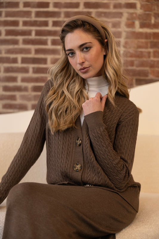The Trina Knit Set features a rich brown hue with subtle woven detailing for added texture. The set includes a button-down cardigan and a matching skirt, creating a cozy yet polished look that's perfect for effortless everyday style.